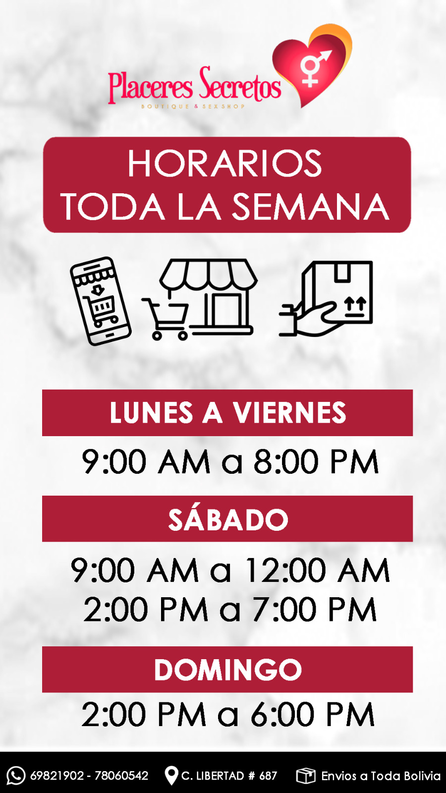 Placeres Secretos es una tienda virtual (alojada en la web); y cuenta con una tienda física en la ciudad de Santa Cruz de la Sierra, desde donde se despacha pedidos para toda Bolivia.