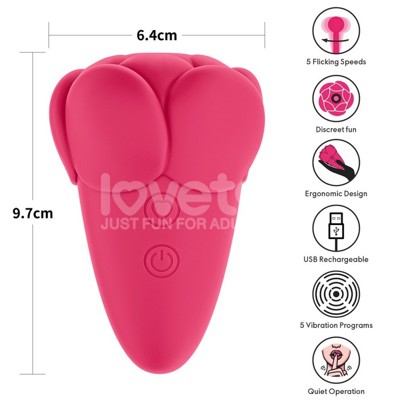 Experimenta la cima del placer sensual con el vibrador recargable Flicker de Love Toy. Inspirado en la delicada belleza de una flor, su diseño en forma de pétalo alberga un tentador tallo vibrante en el centro. Perfectamente posicionado para brindar una estimulación exquisita a tus zonas más sensibles. Diseñado para quienes anhelan excitación y satisfacción inigualables, este lujoso vibrador de silicona promete una aventura de placer sin igual. Características principales 5 programas de vibración: Desde un suave murmullo hasta un potente rugido. 5 velocidades de vibración: Diseñado para imitar la sensación íntima del tacto de tu pareja. Hecho de silicona y ABS seguros para el cuerpo para una sensación de lujo y una experiencia segura. La luz parpadeará durante la carga y permanecerá fija una vez cargada por completo. Disfruta de hasta 90 minutos de juego continuo con una sola carga. Instrucciones de uso Ubicado en la parte inferior, mantén pulsado para encender/apagar el dispositivo. Pulsa cada vez para recorrer las 5 frecuencias de vibración. Ubicado en la parte superior, presione para activar la función de toques. Función de pausa: Mantenga presionado el botón de toques para pausar la función. Puede enjuagarlo con un chorro suave de agua y colocarlo boca abajo para que se seque. Evite que entre agua en el orificio de ventilación mientras lo enjuaga. Procure mantener el agua alejada de esta abertura lo más posible. El dispositivo no es resistente al agua y no debe sumergirse en agua. Use un paño húmedo con agua jabonosa para limpiarlo a fondo. Límpielo antes y después de cada uso. Información del producto Material: Silicona. Carga: Recargable (cable USB incluido). Color: Rosado. Vibración: 5 programas de vibración + 5 velocidades de vibración. Código EAN: 6942063401827. Tamaño del producto: 9,7 cm, ?6,4 cm. Tamaño del paquete: 9,2 x 7,8 x 12,2 cm. Peso del paquete: 235 g.
